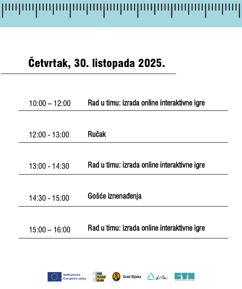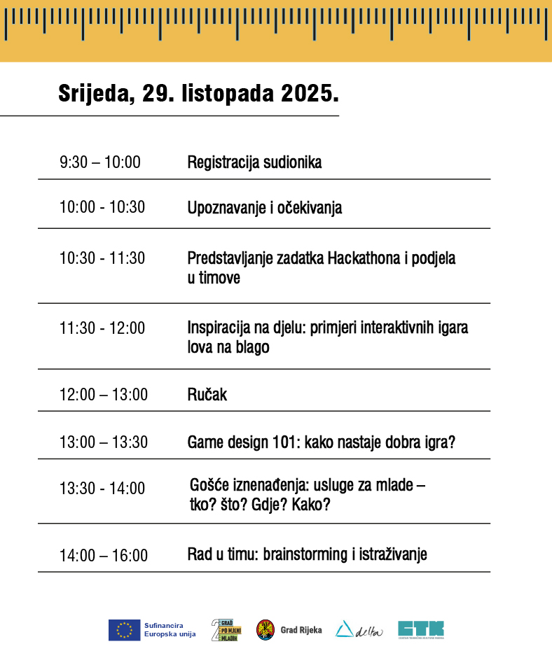 Od 29. do 31. listopada u Centru tehničke kulture Rijeka održava se Hackathon: Lov na usluge. Tamo ćeš s mentorima i drugim mladim osobama u tri dana osmisliti interaktivnu online igru koja će na zanimljiv način približiti usluge koje Grad Rijeka i njegove ustanove nude mladima. Hackathon je događanje na kojem u kratkom i intenzivnom vremenskom okviru timovi rade na razvoju rješenja za određeni problem ili na osmišljavanju digitalnog prototipa. Sudionike Hackathona: Lov na usluge očekuje rad u timu, razmjena ideja i stvaranje konkretne interaktivne online igre koja će mladima približiti usluge namijenjene njima u gradu Rijeci.