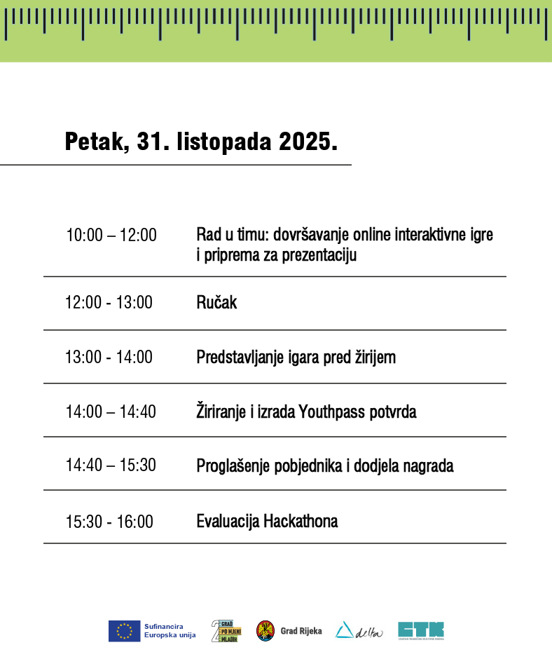 Sudjelovanjem ćeš steći praktično iskustvo rada u timu, razviti digitalne i kreativne vještine te naučiti kako prezentirati svoje ideje i surađivati s različitim dionicima, a sve uz podršku sjajnih mentora s višegodišnjim iskustvom u razvoju i dizajnu igara. S obzirom da je aktivnost dio Erasmus+ projekta Grad po mjeRI mladih, svi sudionici dobit će Youthpass certifikat, europski instrument kojim se potvrđuje sudjelovanje u aktivnostima neformalnog i informalnog učenja te razvoj različitih kompetencija, a koji ti može biti koristan za buduće projekte, praksu ili zapošljavanje.